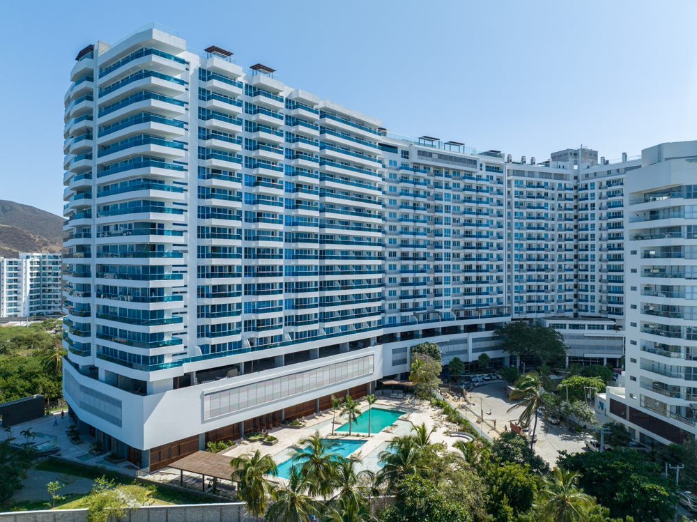 Stunning and luxurious sea view apartment in an exclusive urban beach in Bello Horizonte, Santa Marta. Just 8 minutes from the Airport or Zazué Mall, but far from the hectic city center and crowded Rodadero – it seriously can't get any better than this! You will enjoy 2 huge swimming pools, a private & public beach, snack bar, children's area, or simply appreciate the spectacular sunsets from the balcony. (Please note: The hammocks have been removed and are no longer available.)