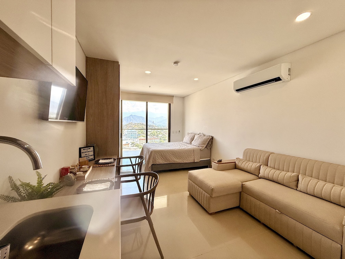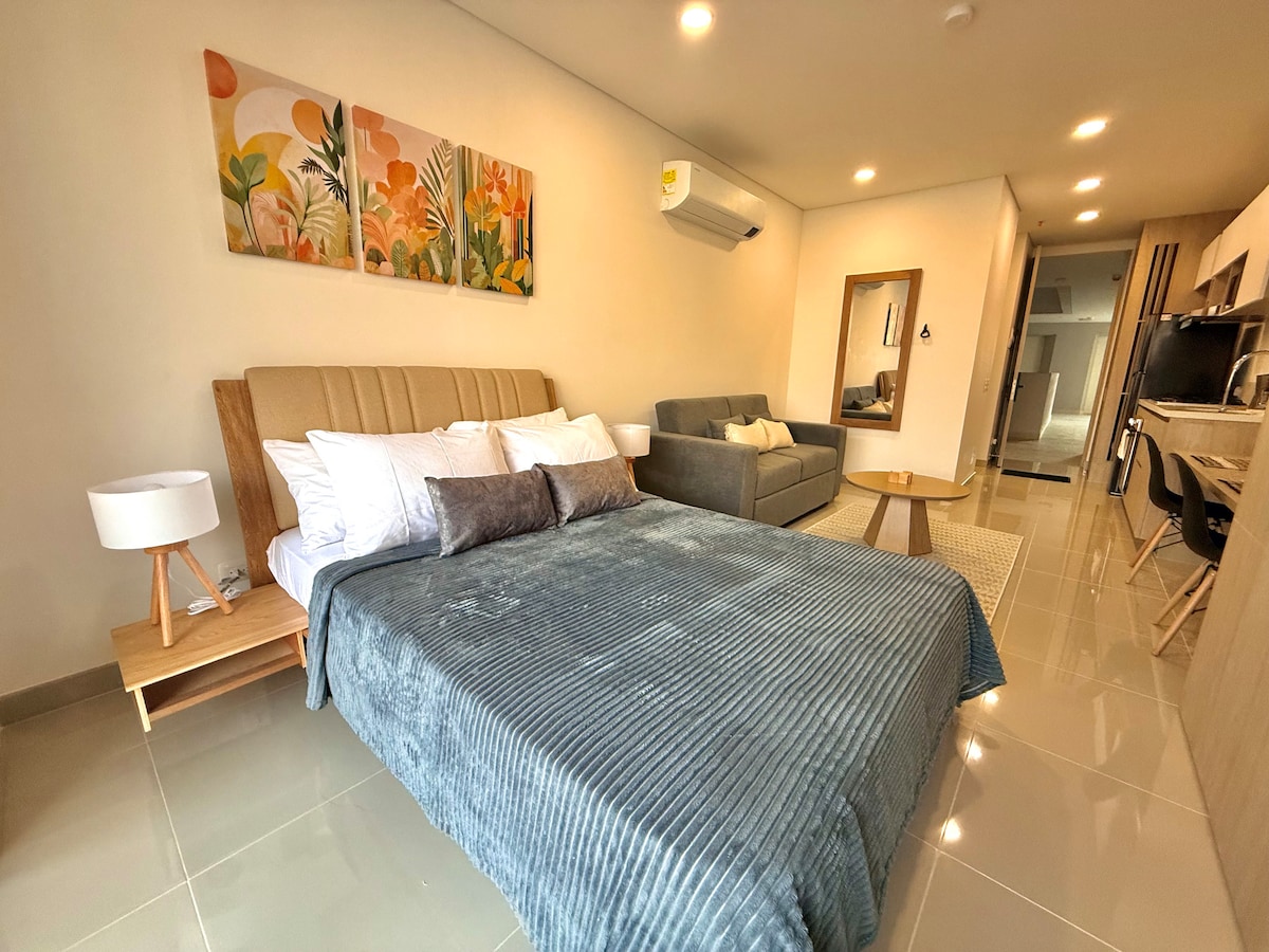 Apartasuite acogedora y funcional, ideal para hasta 3 personas, equipada con cama doble y sofá cama doble, pensada para el descanso y la comodidad. Cuenta con cocina integral, lavadora, baño privado y un balcón con vista, perfecto para disfrutar de momentos tranquilos durante tu estadía.