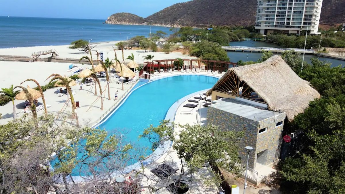 Despierta con la brisa del mar y camina por un sendero iluminado hasta una playa privada a solo 20 metgros del hermoso mar azul. Disfruta más de 21 jacuzzis, piscinas infinitas, gimnasio, sauna, turco y jaula de golf. El restaurante con la mejor comida local directamente en la puerta del apartamento o servicio a la playa. A solo 10 minutos del aeropuerto, este espacio nuevo te ofrece confort, vista al mar y momentos inolvidables en Santa Marta con tu familia o amigos.