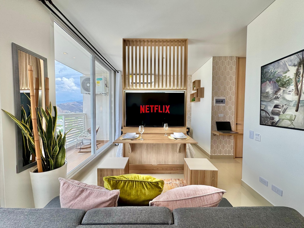 A *fully furnished modern suite* in Santa Marta just a short walk from Salguero Beach & close to El Rodadero, one of the city's most popular tourist spots. ✨ Highlights: Rooftop pool, Jacuzzis, Sauna, Turkish Bath, Game room, & Gym. MORE ⬇️. The building has free parking for visitors, subject to availability. The suite has a mountain view. Whether you're looking to unwind or explore, this suite is the perfect base for your time in Santa Marta.