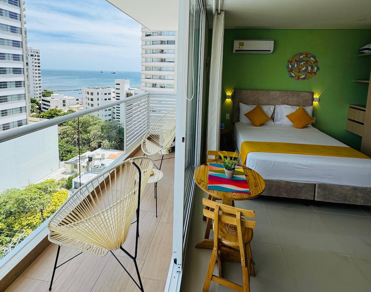 Aparta suite en Porto Horizonte piso 14, hermosa vista donde te relajarás en pareja, podrá disfrutar de un masaje en pareja en este Jacuzzi viendo el atardecer al fondo con el mar caribe de complice. Cama tipo queen con un TV 55’ donde podrás disfrutar tus series favoritas. La suite cuenta con cocina equipada para que puedas preparar un rico desayuno y te tomes un cafe en la mañana. Agua caliente y todo lo necesario para estar tranquilos. El edificio está equipado con una increíble piscina!