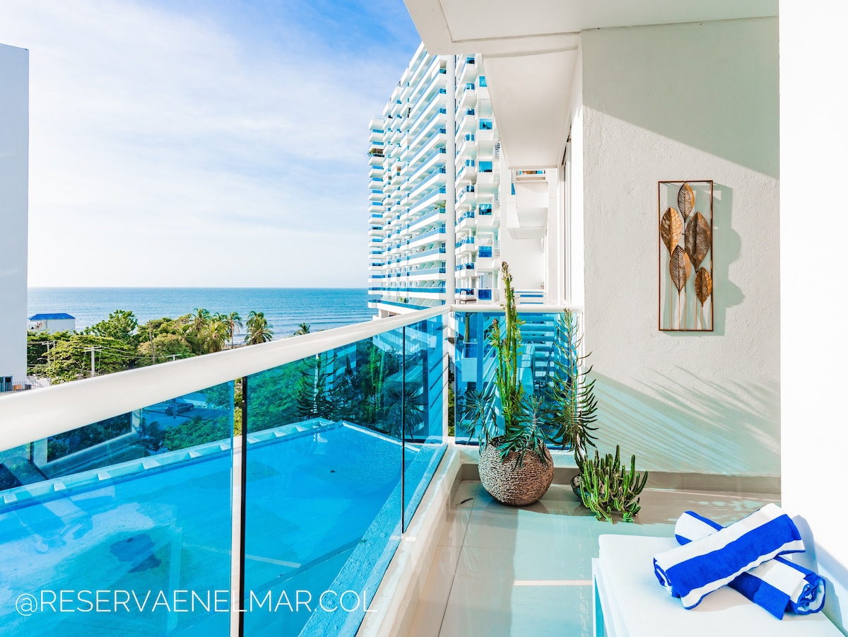 Privilegiado apartamento frente al mar, con jacuzzi privado. Está ubicado un exclusivo edificio del complejo Hotelero Irotama, con acceso a todas las instalaciones del resort 5 estrellas incluyendo restaurantes, bares, piscinas, práctica de golf, spa, cancha de tenis, gimnasio y actividades todos los días. Se encuentra ubicado en Bello Horizonte, a 5 Km del aeropuerto Simón Bolívar y a 7 Km del Rodadero. Transporte gratis desde y hacia el aeropuerto y dentro del resort.
