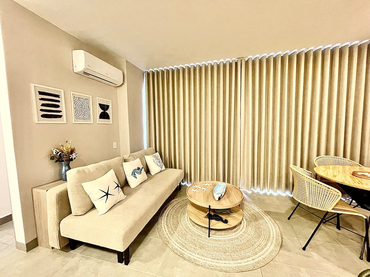 * ¡No hay cobros de manillas! * ¡No gastarás en taxis! Tienes a pocos metros la playa de Bello Horizonte y a unos pasos el C.C Zazúe, tiendas y supermercados. * Aparta estudio con todo lo necesario. * Aire acondicionado solo en la habitación. * Ubicado en segundo piso en edificio viejito y bonito. * Tienes un espacio de parqueadero cubierto. * Piscina con profundidad máxima de 1,20 m