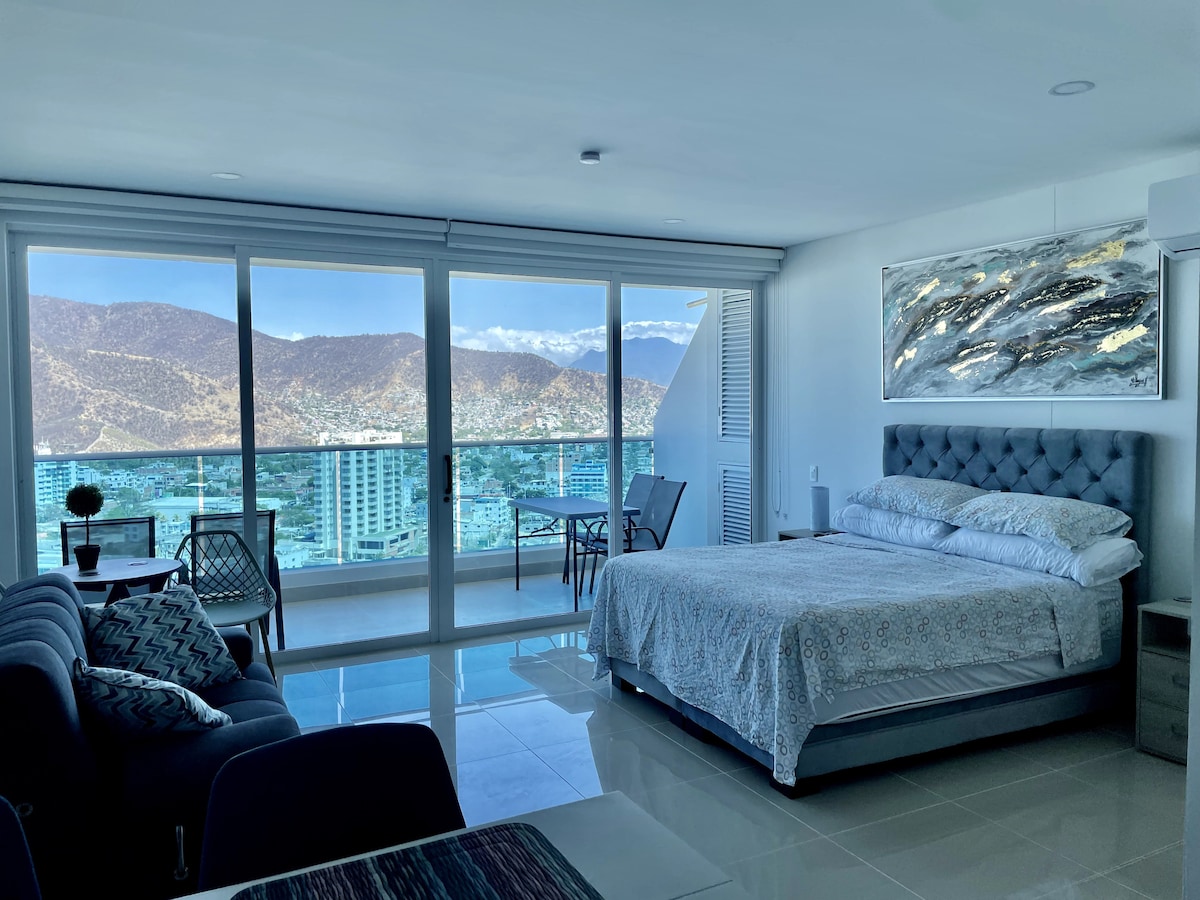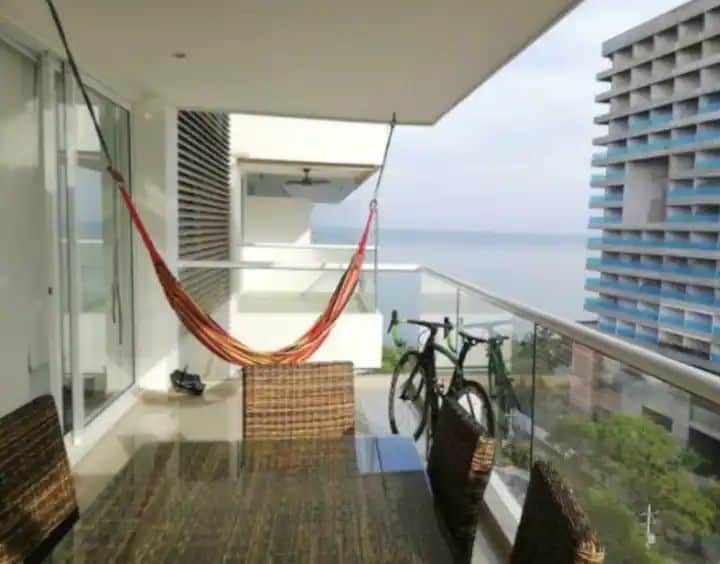 Espectacular apartamento moderno para estrenar en un piso 17 con vista al mar y salida directa a la playa. Espacio agradable para tomar vacaciones, descansar y/o trabajar home office. A 10 minutos del aeropuerto internacional y del centro histórico de Santa Marta, cerca a zona de restaurantes, bares, centros comerciales y farmacias. A menos de una hora del Parque Nacional Tayrona, Taganga, Minca. El apartamento cuenta con un amplio balcón donde podrás disfrutar del mejor atardecer de Colombia.