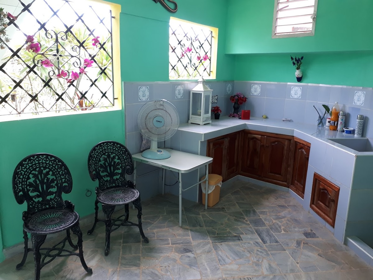 Es un apartamenento independiente amplio. Con un dormitorio con dos camas, (una grande y otra más pequeña), aire acondicionado, caja fuerte, perchas para la ropa y televisor. Un baño con agua fría y caliente; cocina equipada con todo para la elaboración de alimentos (microondas, cafetera, tostadora, ollas, fogón de gas, refrigerador), una pequeña mesa plegable y tres taburetes para comer, uso de la lavadora. Una terraza común rodeada de plantas con sillones, mesa y sillas y un hermoso jardín.