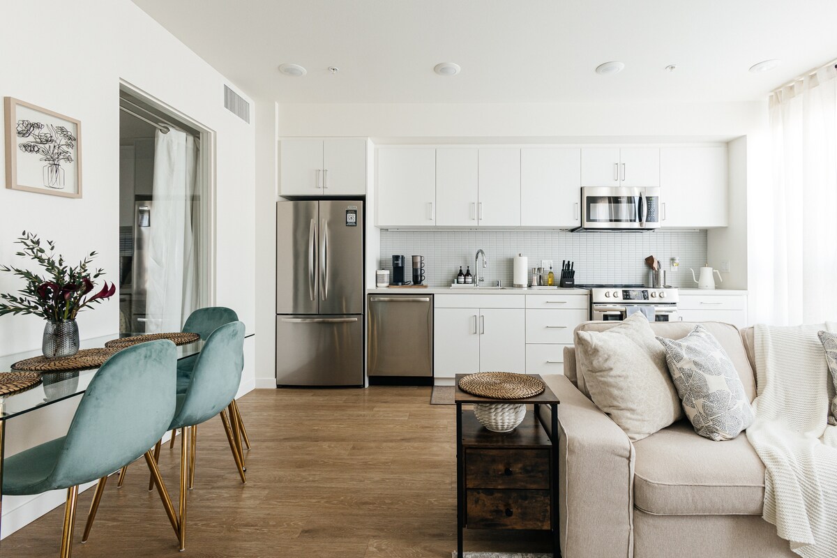 Welcome to your cozy Santa Monica stay! Bright, spacious, and modern one bed/one bath in the heart of downtown Santa Monica. Your home away from home is only a short and beautiful walk to the Pier, Beach, Third Street Promenade, and Santa Monica Place. Whether you're in town for work or vacation, this space is perfect! Enjoy a private balcony, comfy queen bed with hotel-style linens, fast Wi‑Fi, equipped kitchen, full bath, easy self check‑in, and a parking garage for your convenience.
