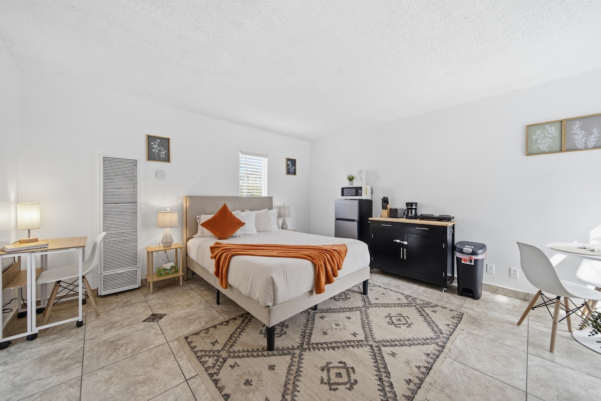Charming Venice studio just a block from the iconic Boardwalk! Enjoy a partial ocean view, comfy bed, small couch, and fully stocked kitchen, plus a restored vintage bathroom. Feel the beach vibes and historic charm while being only 25 minutes from SoFi Stadium and LAX. Perfect for solo travelers or couples looking to explore Venice, relax by the ocean, and enjoy the best of LA from a cozy, stylish home base.