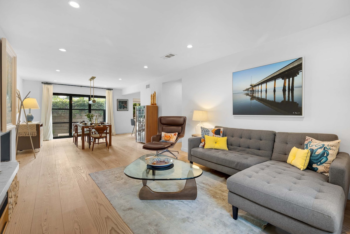 Escape to a Scandinavian-inspired coastal oasis just minutes from Venice Beach. This bright 3-bedroom, 2 bath home features natural wood floors, seamless indoor-outdoor living, a cozy fireplace, and a fully equipped kitchen with stainless steel appliances. Relax in the lush private garden with alfresco dining, a charcoal BBQ, and a fire pit. With central AC/heat, high-speed Wi-Fi, premium linens, and family- and pet-friendly comforts, this stylish retreat offers the perfect Venice coastal stay.