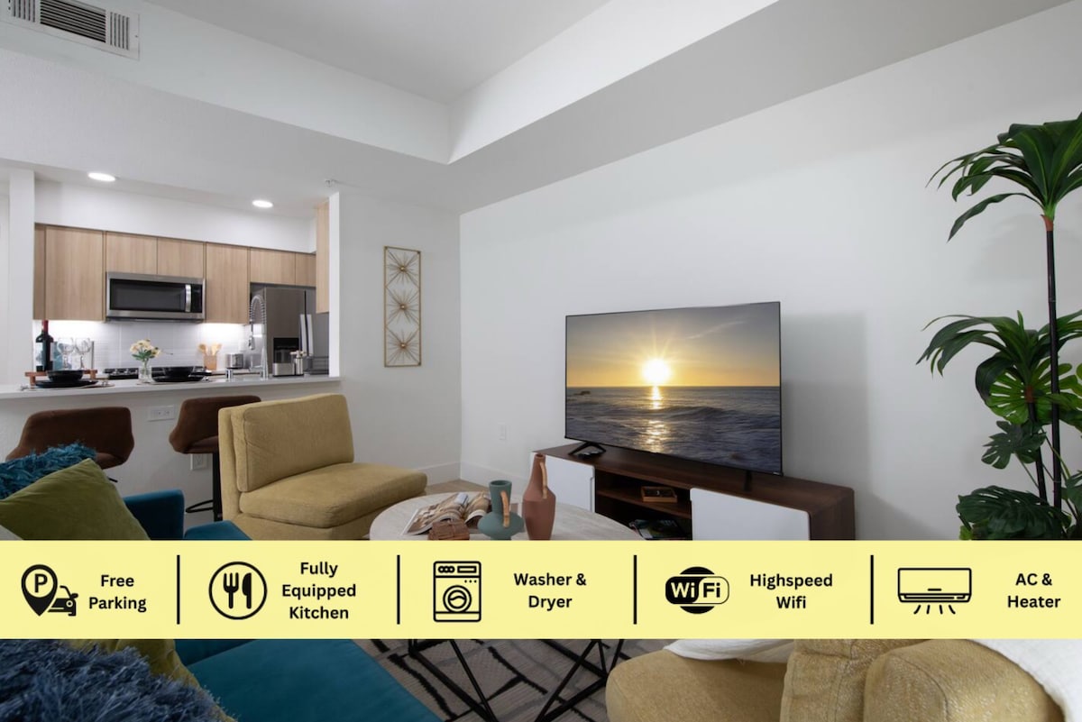 Enjoy a modern 1-bedroom apartment near the beach 🌊 with contemporary furnishings 🏡, a queen bed 💑, and a fully equipped kitchen 🍳. Amenities include high-speed Wi-Fi 📶, a smart TV 📺, in-building laundry 🛠️, and secure parking 🚗. Close to dining 🍽️, shopping 🛒, and coastal attractions 🏖️, it's the perfect blend of comfort and convenience.