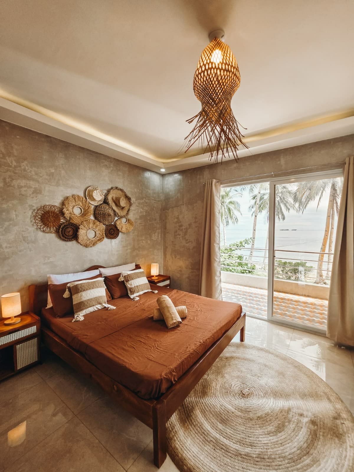 Wake up to the sunrise to the sound of the ocean waves lapping on the white sandy beach. Relax on the deck to hang out with your family. Personal maid service. On-site spa discounts. Walking distance to Cloud 9 with spectacular views of Rock Island, Stimpy's, and Jacking Horse surf spots. Full kitchen, AC, WiFi, hot shower, outdoor deck. Walking distance to cafes, restaurants and grocery. Airport transfers, motorbike rental, surf lessons, pilates, and massages can be organized.