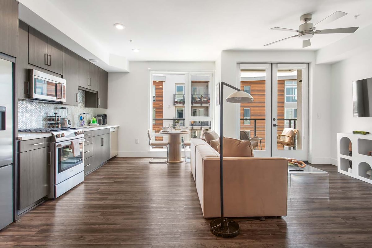 Welcome to your cozy Santa Monica stay! Bright, spacious, and modern one bed/one bath in the heart of downtown Santa Monica. Your home away from home is only a short and beautiful walk to the Pier, Beach, Third Street Promenade, and Santa Monica Place. Whether you're in town for work or vacation, this space is perfect! Enjoy a private balcony, comfy queen bed with hotel-style linens, fast Wi‑Fi, equipped kitchen, full bath, easy self check‑in, and a parking garage for your convenience.