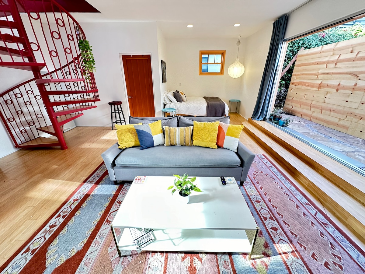 Experience this unique mountain loft, designed by a local Topanga artist, with 16' ceilings and views of the surrounding epic mountains. Enjoy a complimentary bottle of wine, our outdoor barrel steam sauna, and bring the kids or pets for hikes right outside the front door. Book an on-site massage or do a yoga session, watch movies on TVs in every room, or simply relax. Medley Ln offers some of the best views in all of Topanga.