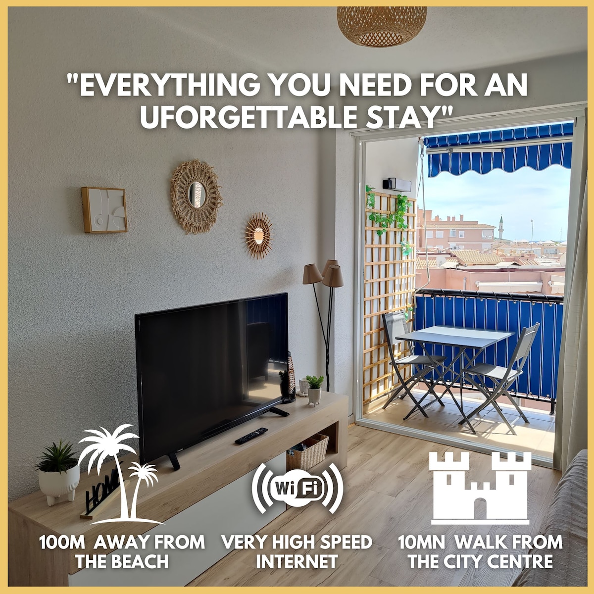 1 min andando de la playa. 100% reformado integral. Aire Acondicionado. Gran Terraza con vistas al mar, ascensor, todos los electrodomésticos nuevos, todos los muebles nuevos. wifi fibra 480MB, TV Samsung 55" (Smart TV, Netflix, Youtube, etc.), limpieza profesional, salón con sofá cama (muy cómodo) 1,35, cocina americana con isla, habitación de matrimonio cama 1,50 con salida a la terraza. Baño con plato de ducha, lavadora, cafetera, tostador, microondas... Todos los servicios a menos de 5 min