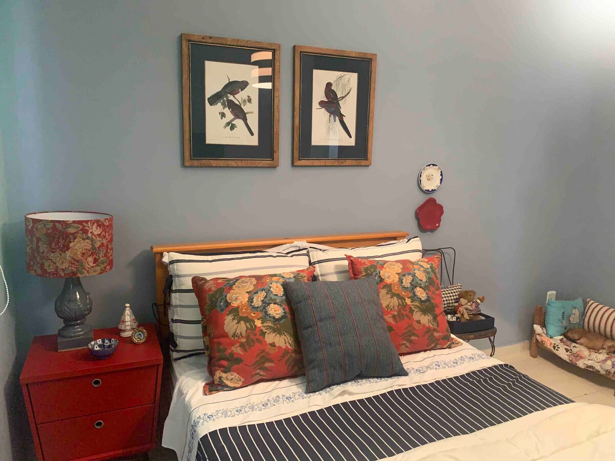 Quarto com cama queen size. Tv com acesso a Netflix, Globoplay etc. Ventilador de teto. Guarda roupas. A disposição banheiro, cozinha, sala de estar, wi-fi, garagem e gancho de bicicleta.