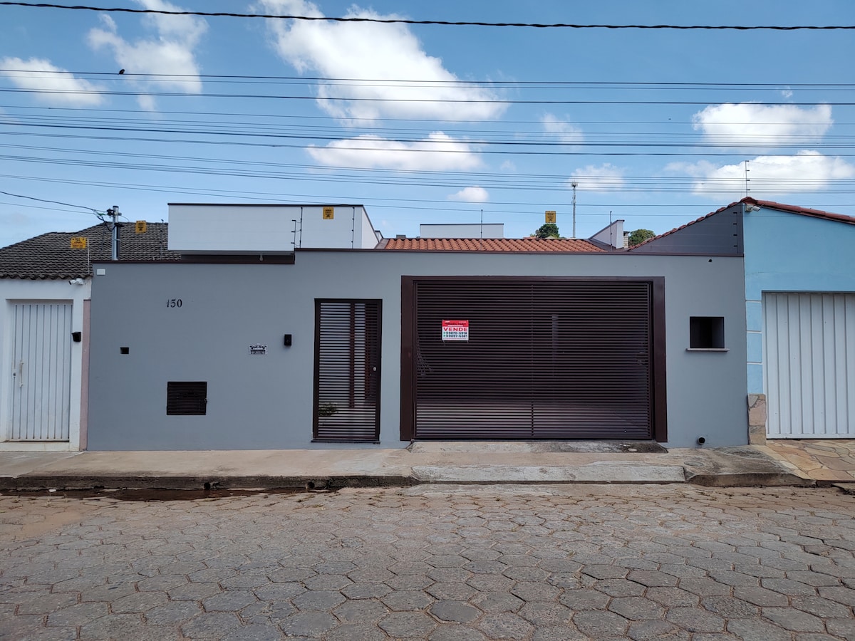 Sala 2 ambientes (estar e jantar), cozinha equipada com fogão, geladeira e microondas, 3 quartos, sendo 1 suíte, banheiro social, área de churrasco gourmet com fogão a lenha e churrasqueira, piscina e lavabo na área externa. Garagem para 3 carros. Ar condicionado na suíte e ventilador de teto na sala de estar e em um dos quartos. TV, geladeira, 1 cama de casal, 4 camas de solteiro sendo renovados, tudo estará funcionando e prontinho para sua hospedagem.