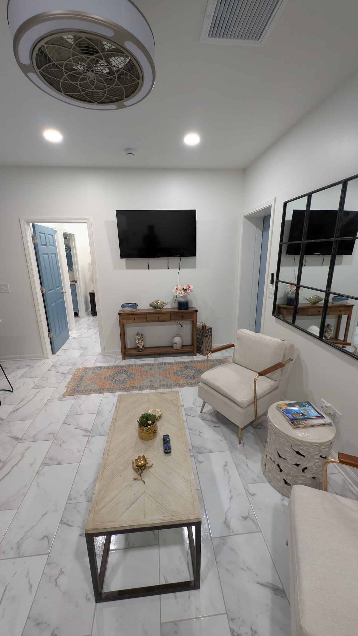 Modern above garage studio apt with private entrance and patio. 1.5 blocks from the South Walton beaches! Enjoy a large living/dining area and separate sleeping space with king bed. The sofa also converts to a queen size bed. Separate kitchen with refrigerator, stove top & microwave. Two flat screen TVs w/ private Wi-fi, Live Stream, Netflix and HBO. Enjoy 30A's newest public beach, just a short walk, right at the end of our street.