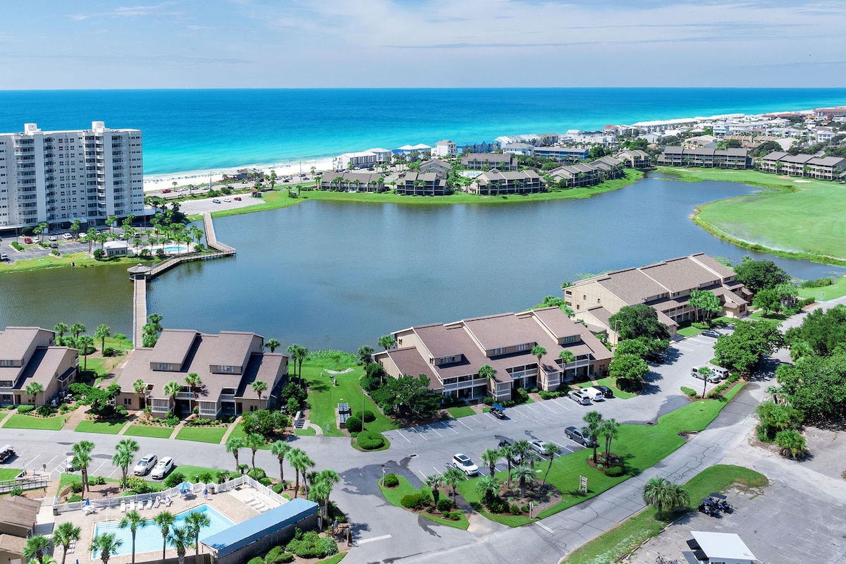 ***COMPLIMENTARY BEACH SERVICE for 2 is included for all stays from March 15th through October 31st!*** 🌊 Discover Your Ultimate Vacation Oasis at Sunset Villa 🌊 Sunset Villa 22B offers a serene retreat in the desirable Crystal Beach area of Destin, where you will be greeted by tranquil lakefront views and lush palms, all while being just across the street from the ocean. Delight in beach life being just steps to the emerald gulf waters, a short walk or drive to local restaurants, and a hop,