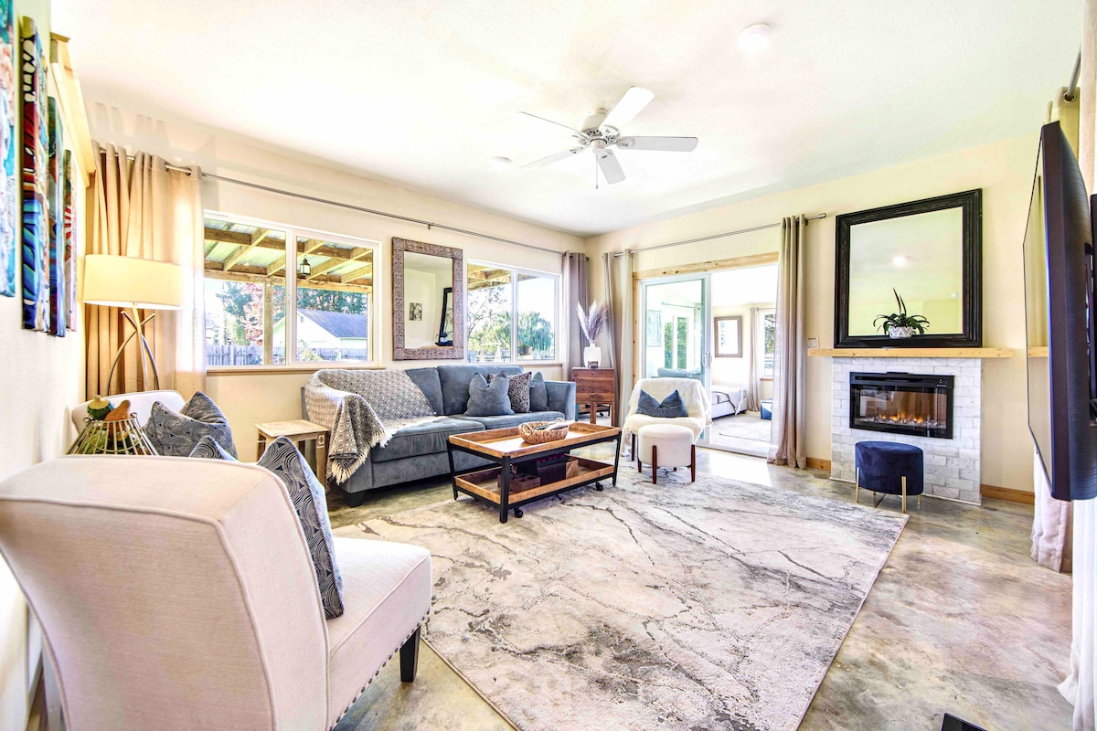 A boutique farm retreat, elevated and rare, with concrete floors and artisan care. Rainbow eggs greet you when you arrive, alongside rich coffee and wide-open sky. Horses roam pastures just beyond the glass, a private hot tub, and room to relax. Barn doors glide, natural light pours, a curated escape with thoughtful decor. Designed for rest, crafted with style, luxury that greets you with a wine country smile. Slow down, settle in, savor the stay -this is where comfort meets your unique getaway!
