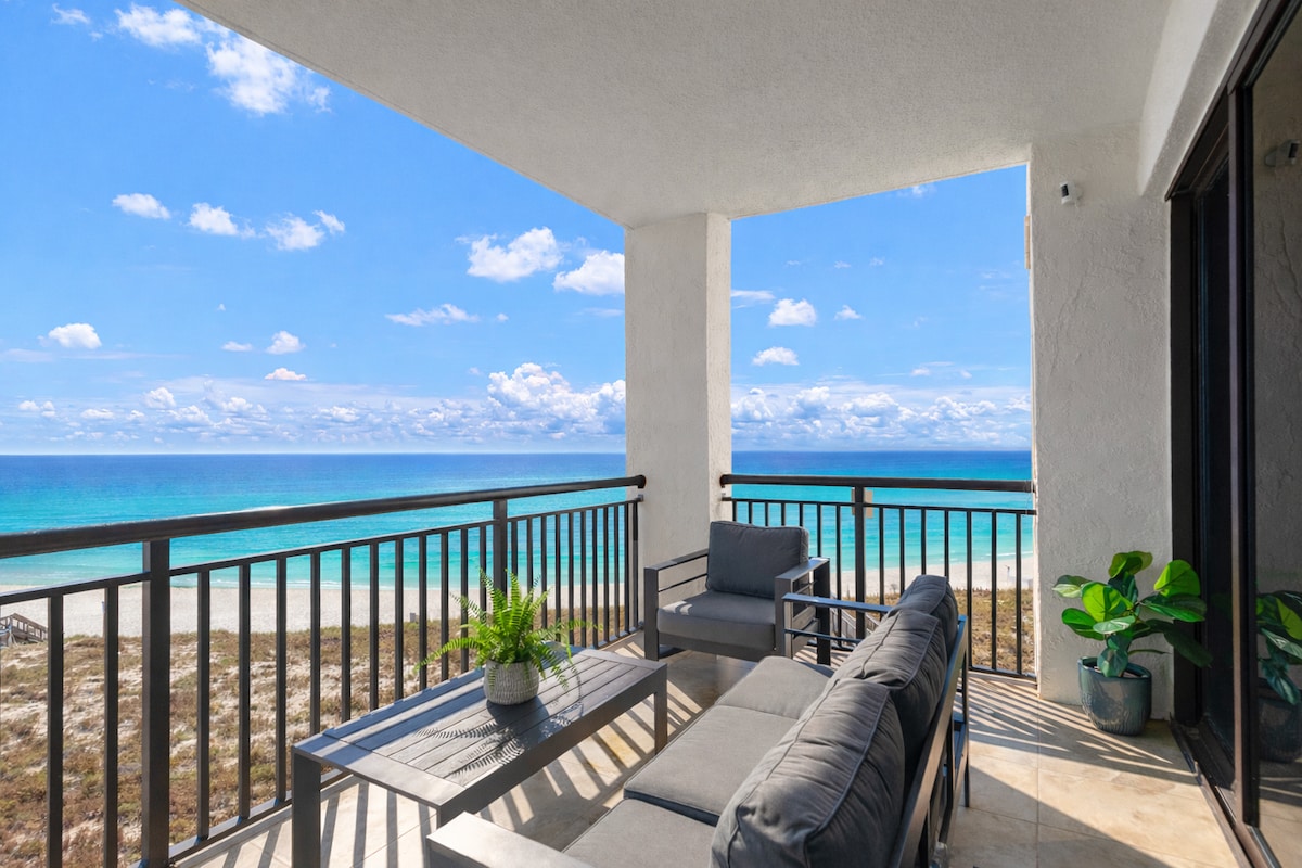 Welcome to Pensacola Perch, an 8th‑floor beachfront condo offering expansive views of Pensacola Beach—perfect for dolphin watching and catching the Blue Angels airshow. This modern 2BR/2BA condo sits in the highly sought‑after Emerald Isle gated resort, where guests enjoy premium amenities including direct beach access, two swimming pools, a hot tub, sauna, and a beachfront fitness center. From March–October, enjoy complimentary beach chairs and an umbrella from La Dolce Vita.
