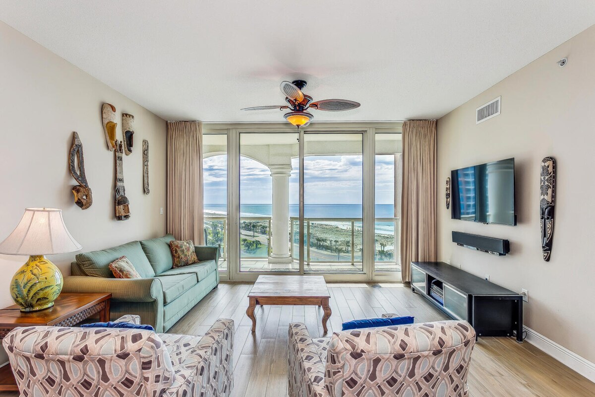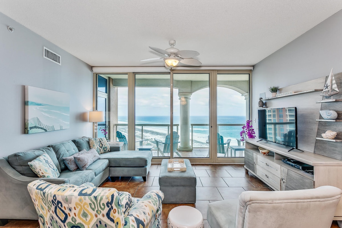Stay in Tower 3 1301 and enjoy Sunrise to Sunset Views from your 13th floor wrap around balcony. Eat outdoors after using the electric grill on the balcony while you enjoy the view. 3 bedrooms all have private bathrooms. Each has a water view to wake up to! Look at all the seating in the living room! Dining area seats 6 at the table with 3 additional at the kitchen bar. Tower 3 is closest to the beach access and just a short walk to Tennis and Lifestyle Center for spa, restaurants, fitness