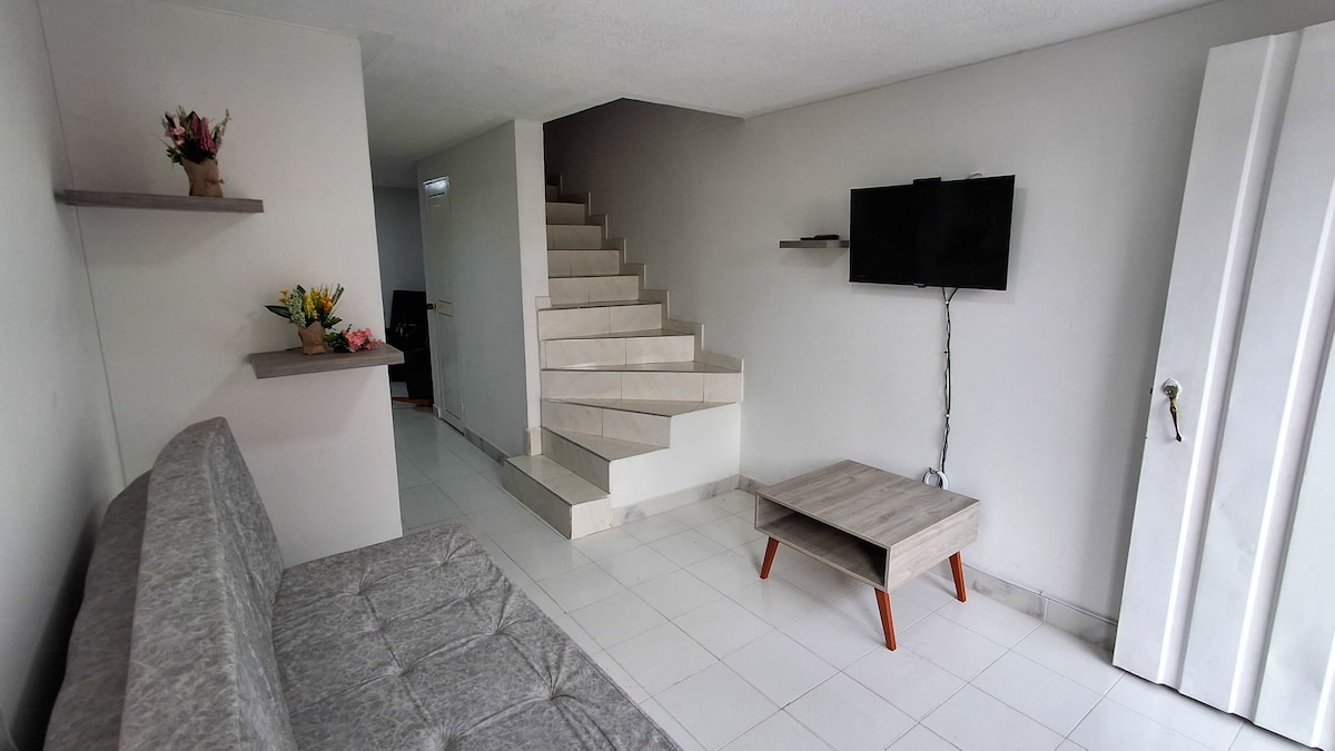 Acogedor aparta estudio amoblado con acceso autónomo, super bien ubicado, zona segura, cerca al centro de la ciudad y cerca a todo. Cerca al parque el lago, plaza de Bolívar, coliseo mayor y a una cuadra del centro comercial San andresito. Cuenta con una cama doble, mesa para trabajar, servicio de plancha o lavandería por un módico costo adicional, secador de cabello, cocina equipada, baño con agua caliente, TV y Internet por cable y wifi.