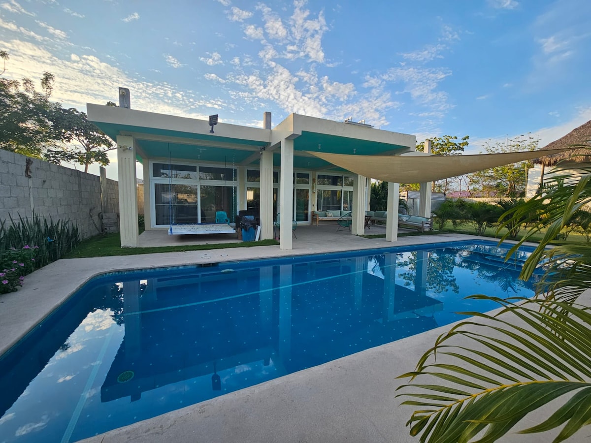 Casa de Playa frente al Mar, completamente privada. La casa cuenta con agua dulce se hizo cisterna para el efecto, y la piscina es de agua salada. Cocina completamente equipada con A/C. Dos habitaciones con A/C y baño privado cada una. Rancho de descanso con hamacas, salida peatonal a la playa, ideal para descansar, acompañado de amigos y familiares, Tranquilo y acogedor. Pensado para la privacidad de nuestros huéspedes. 3 parqueos privados adentro de la propiedad.