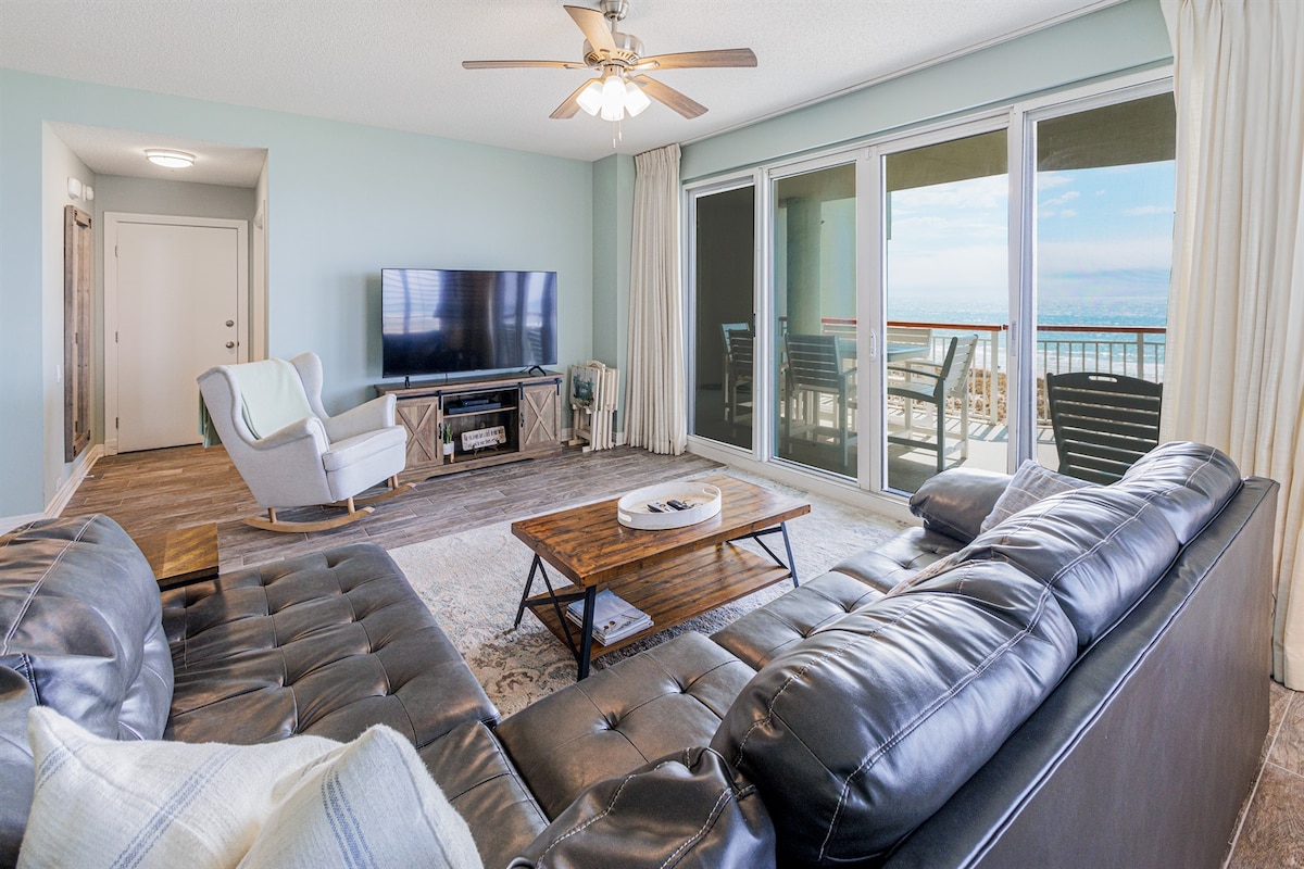 Beachfront Corner Condo in Destin - Panoramic Gulf Views Summer dates just released! Experience luxury in our Destin beachfront condo! This 3-bedroom, 2-bath unit offers panoramic Gulf views from the living area, kitchen, and master bedroom. Enjoy a renovated balcony, heated pool, tennis, basketball, pickleball, gym, and sauna. Beach chairs and umbrella included March-October. Convenient elevator and steps access. Book your Destin vacation rental now for an unforgettable beach getaway!