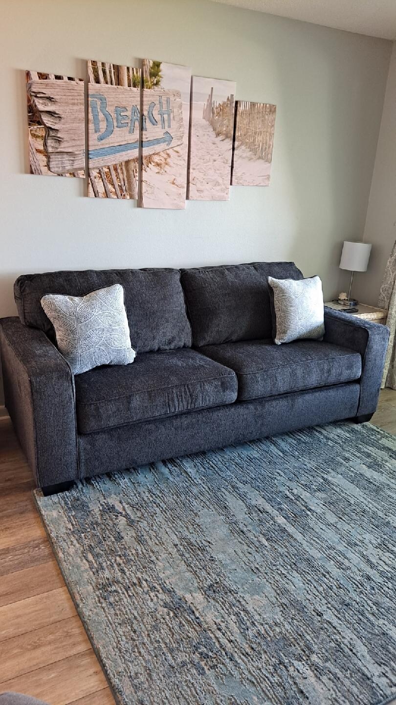 The one-bedroom condo is located on Pensacola Beach in Tristan Towers. (The second bedroom is not accessible due to storage use.) Has an incredible view of the Gulf of Mexico and Pensacola Bay (wrap-around balcony). Located on the bay side, a short walk across the street allows easy access to white sand beaches and Gulf waters. The property has tennis courts, a swimming pool, and a pier. Shops, restaurants, and activities are nearby. Free trolley service runs from Memorial Day to Labor Day.