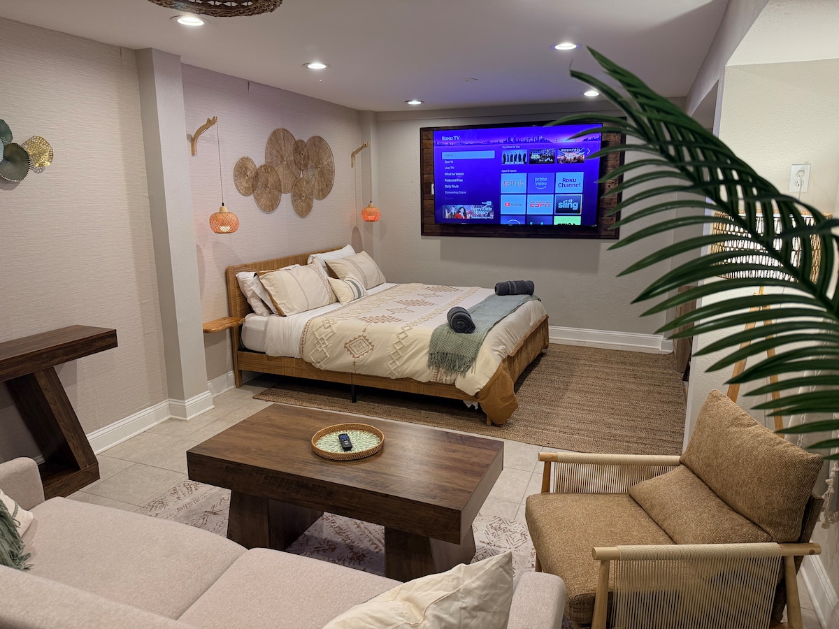 At this modern 1BR guesthouse in the heart of East Hill, you’ll enjoy a walkable neighborhood with plenty of quiet. Inside, soaring ceilings and high-end furnishings make for an upscale but comfortable space. Outside, you're steps from Alga Brewery, local food trucks, and popular morning spots like Jitterbug. Fire up the BBQ and wind down with a glass in hand—and when you’re ready for adventure, downtown and the beach are just 10 minutes away.