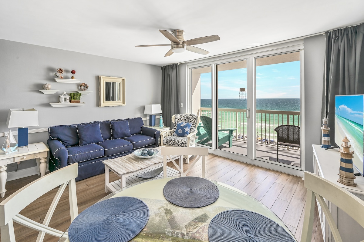 Completely renovated 8th floor condo right on the beach with unobstructed views of the Gulf and the beach. Located in the heart of Destin in popular Pelican Beach Resort, you will enjoy the private beach, multiple outdoor pools, an indoor pool, hottubs and more. Our beachfront condo has been professionally renovated with brand new cabinets, AC, floors, appliances, furniture, kitchen and more. All mattresses are brand new, cool-gel memory foam for a cool night's sleep. Fully stacked kitchen.
