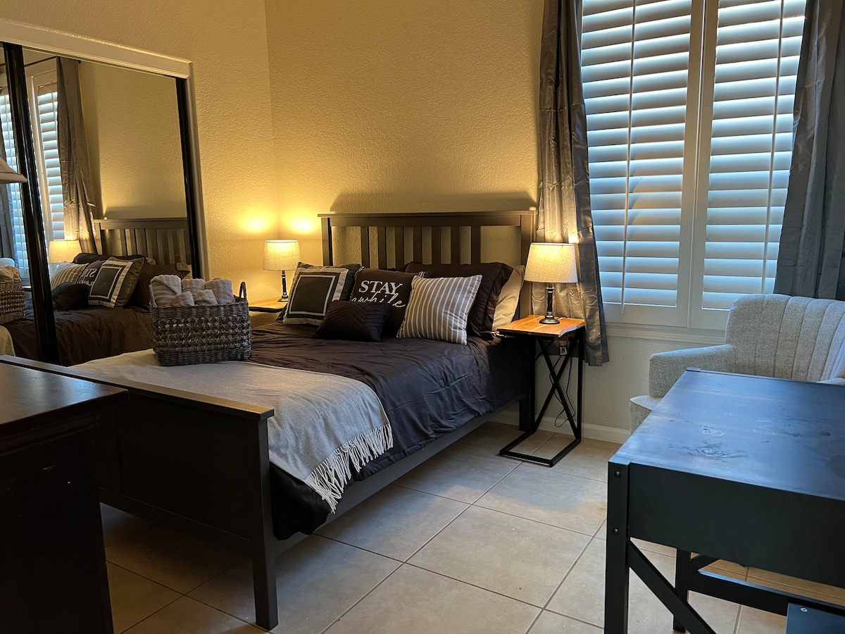 A spacious room in a newly built home in Menifee near Paloma High School and the 215 freeway. Room has its own private entrance with a keypad along with an attached full bathroom, smart TV, coffeemaker, closet, small refrigerator and more. No access to main home, door to rest of home will be locked for the privacy of all parties. AC is central to entire home and not accessible in the guests area. You can request adjustments to temp via message