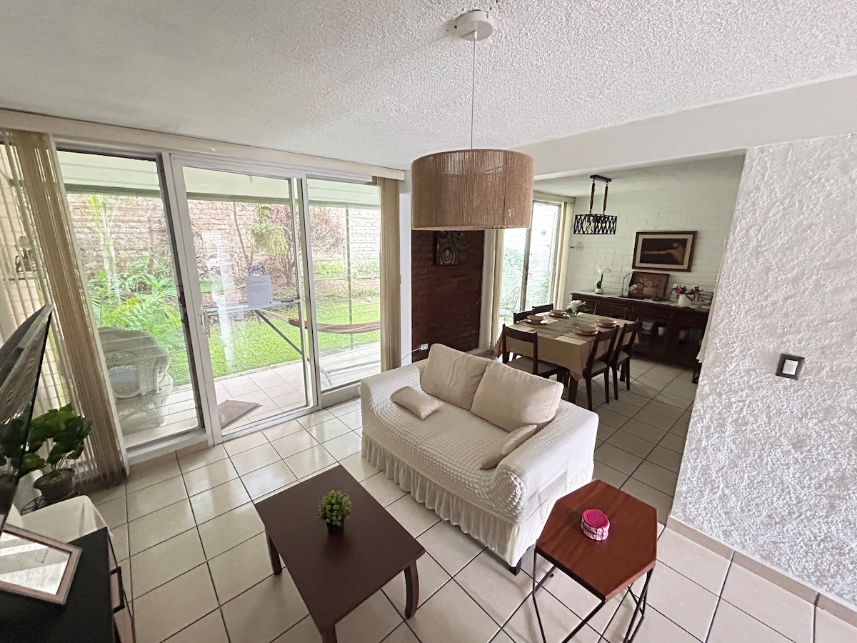 Ambiente acogedor y familiar, cuenta con 2 habitaciones con A/C c/u, 3 camas dobles, cocina equipada, sala-comedor, PRIME Video, 2 baños, lavadora-secadora, plancha y planchador, la ubicación te permite disfrutar diferentes ambientes: a 5min de Plaza Merliot y 7min de parque el principito. En 10 min puedes llegar a centros comerciales como multiplaza, la gran vía y paseo el carmen. El Parque el boquerón y sus restaurantes están a solo 20 min, 40 min de playas y Centro Histórico.