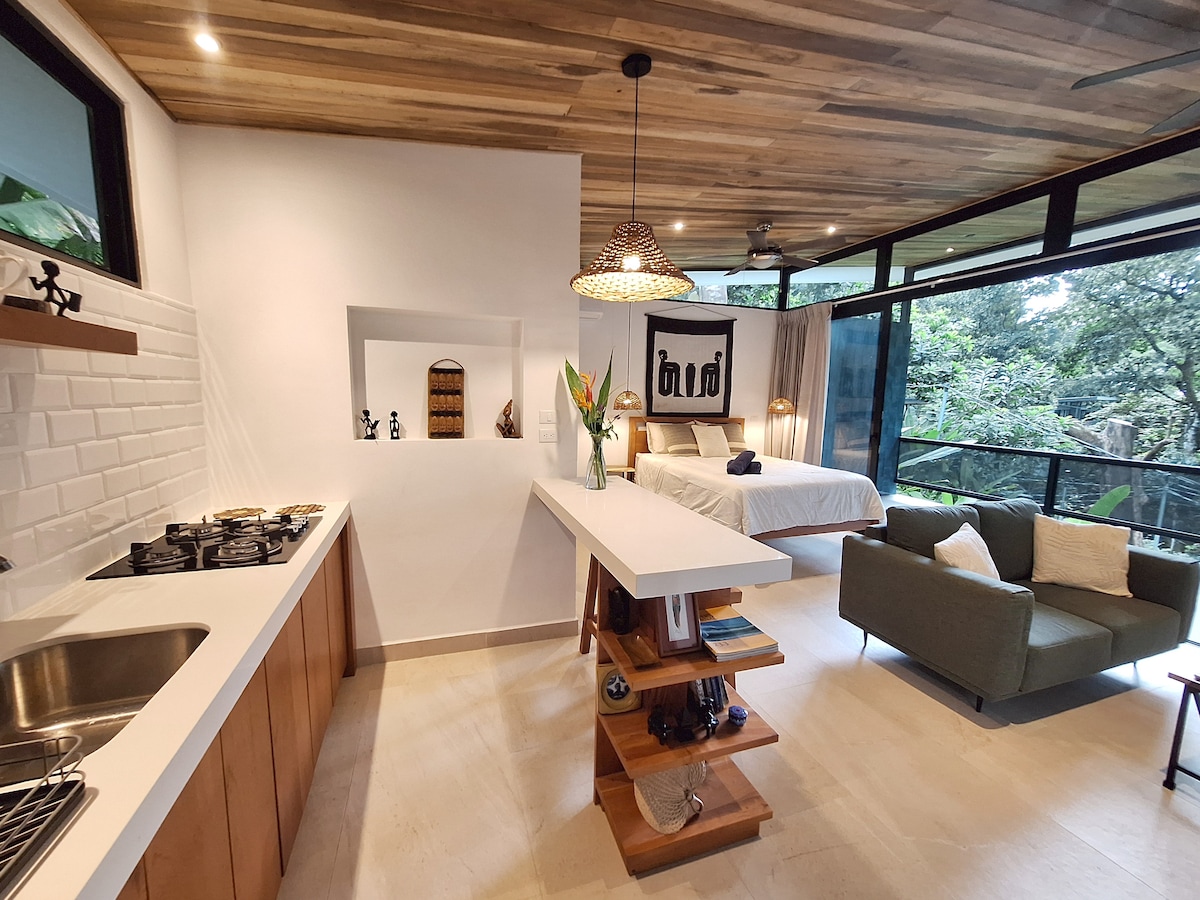 NAIA STUDIO is floating into the jungle of Santa Teresa, overlooking the green valley and pacific ocean. Only a short 3 minute drive directly to the most popular restaurants and beautiful beaches of Santa Teresa. Beginning your day rising up in in the plush bed, overlooking your private plunge pool facing out to the ocean as you listen to the sounds of the jungle. A perfect vacation home for couples or single traveling vacationers.
