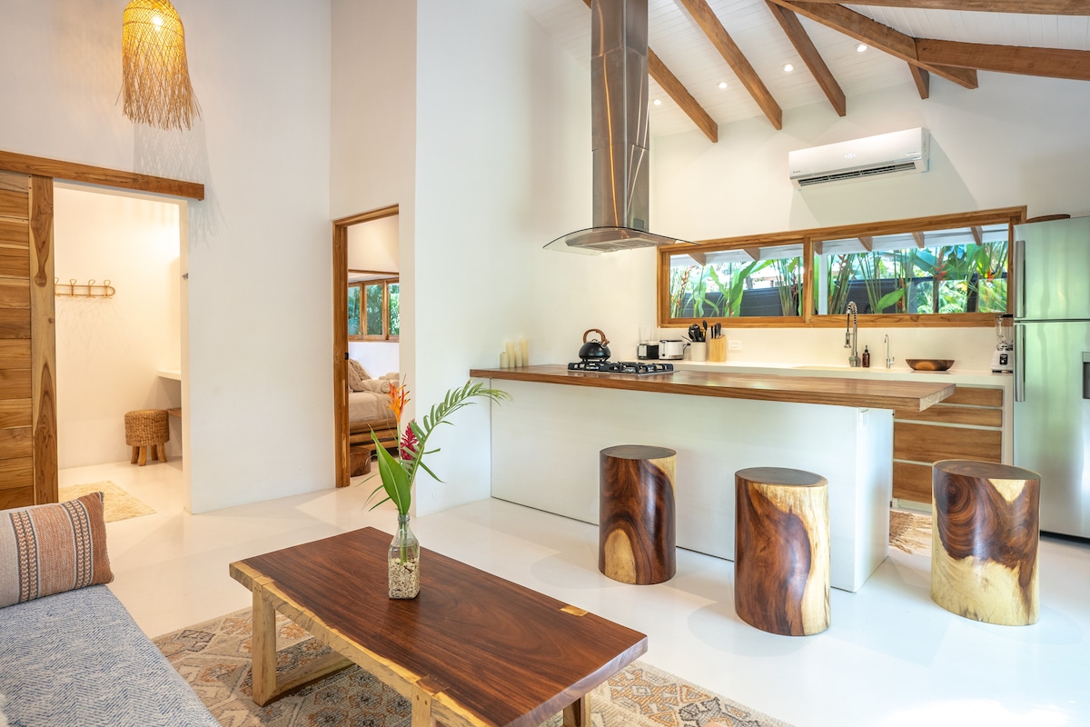 The location of the "Mid Tide Bungalow - Surf Casitas" is just perfect! 2 min walking distance from one of the nicest beaches and best surf spot of Santa Teresa: "Villa Paraíso". You can relax on the beach reading a book under a palm tree, or surf the best waves in town! Our bungalow counts with one bedroom with a king size bed, ensuite bathroom, kitchen and nice terrace.