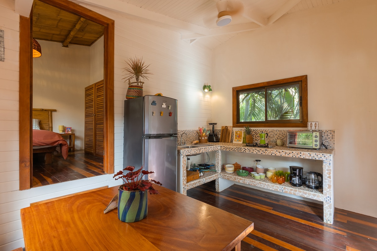 Villa Sereno is a beautiful cozy casita nestled in the heart of Santa Teresa North which offers a fully equipped kitchen, a spacious bedroom with king size bed and a shady ample terrace with dining table and lounge sofà. The place has a very comfortable and friendly atmosphere offering a unique experience to our guests. Settled in a lush tropical garden the villa is also only steps away from the beach access and services like markets, restaurants, cafes, shops, yoga/pilates studios, ATM, etc.