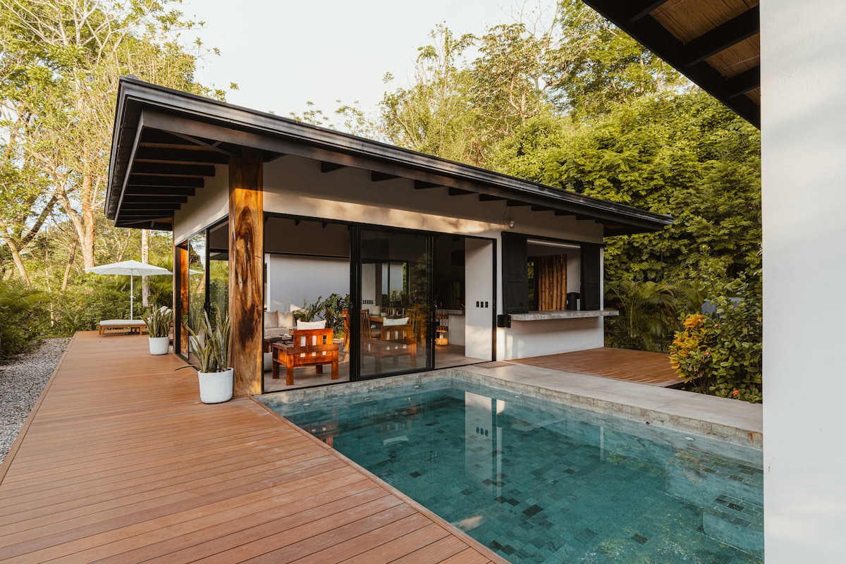 This jungle house is designed for a calm and comfortable stay, surrounded by nature. Built elevated, it features clean and contemporary architecture with natural materials, open spaces, and a strong indoor–outdoor connection. The bright living area includes an office space with large windows and a Pilates studio that opens into the living and dining areas. Ideal for guests who value nature, privacy, serene spaces, and thoughtful design. Very close to the beach and town, yet quiet and peaceful.