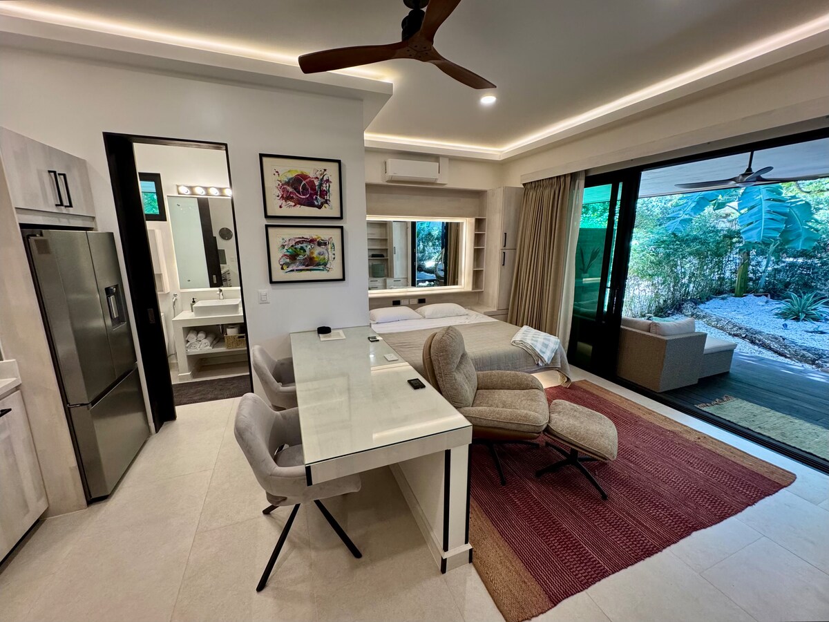 One of two brand new studio bungalows @ ArtStudios in Playa Hermosa, perfect for solo travelers or couples. Savor the timeless design, high-end finishes, and smart touches like pin-code entry, bedside light switches, universal outlets and private high-speed WiFi. Enjoy a full kitchen, Sonos system, private deck with rock garden, gated entry, and access to a pool and rope-net lounge platform. Just one minute’s drive to world-class surf. Comfort meets style in this thoughtfully crafted space.