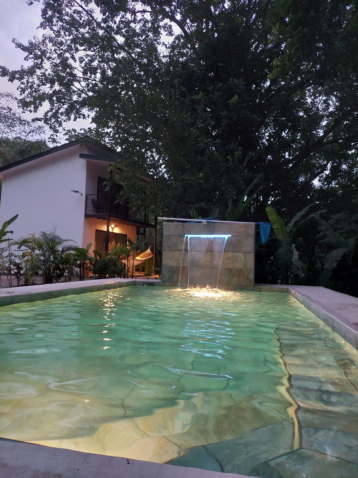 Villa Amapola is 1 of 4 villas onsite. With 2 bedrooms and a queen sized bed in one room and a queen and single bed in the other, it sleeps up to 5 comfy. Full kitchen, living room, tv, ac, wifi, balcony and back deck with hammock and beautiful view. Just a few min walk to the best surf. We have 2 internet service providers on the property with 200 mgs of wifi each, all routers backed up with batteries for potential outages. We are pet friendly and offer laundry service for a fee