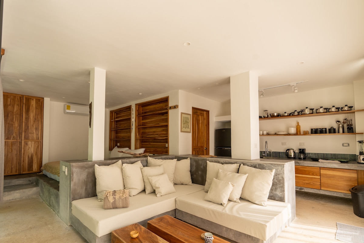 Villa Sereno is a beautiful cozy casita nestled in the heart of Santa Teresa North which offers a fully equipped kitchen, a spacious bedroom with king size bed and a shady ample terrace with dining table and lounge sofà. The place has a very comfortable and friendly atmosphere offering a unique experience to our guests. Settled in a lush tropical garden the villa is also only steps away from the beach access and services like markets, restaurants, cafes, shops, yoga/pilates studios, ATM, etc.