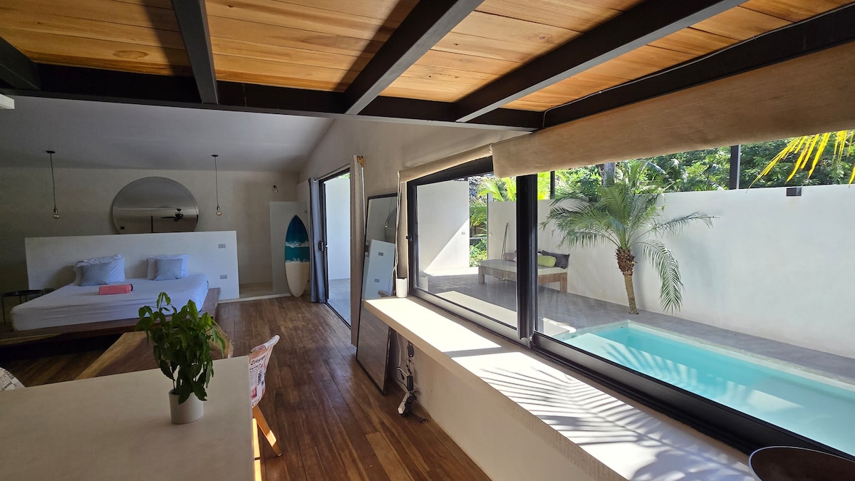 Absorb the charm and rhythm of beautiful Mal Pais. Our spacious penthouse is set back in a tropical oasis with a cozy indoor setup which opens up to a huge tropical pool view balcony. Walk to the beautiful beaches and tide pools. Near the best surf spots! Quiet location, yet a short 10 min drive to downtown's main bustle where you'll find excellent dining options and a fun nightlife. Grocery store, brewery and pizzeria around the corner. Purified water on tap! Fiber Optic WiFi ⚡️ 100 Mbps