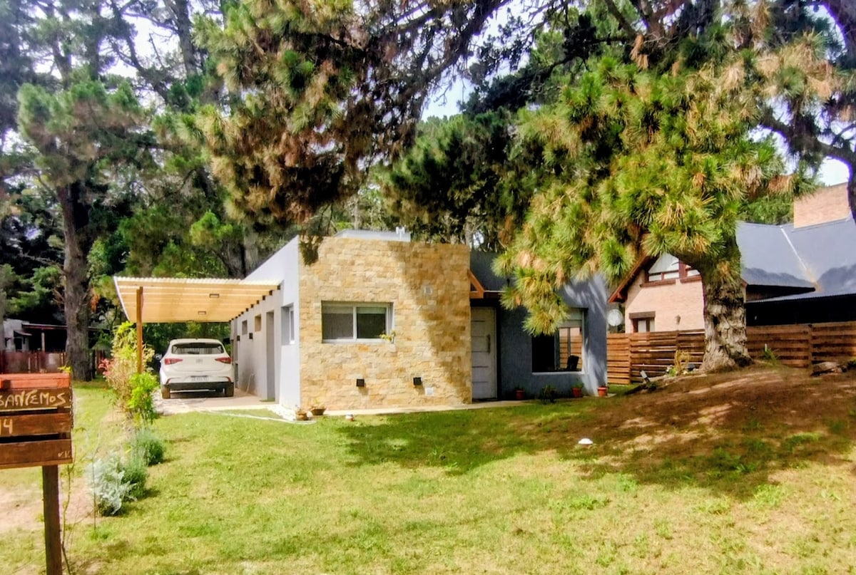 Casa nueva a 7 cuadras del mar y 5 del centro comercial en terreno único de 450m2. Dos habitaciones, una con cama matrimonial y sofá cama. Otra con dos camas individuales y colchon extra. Amplio baño con bidet y barra de seguridad en la ducha. Agua caliente de termotanque y gas natural para cocina, canillas, ducha y salamandra. 2 ventiladores, hamaca paraguaya, juego de jardin con 4 sillas patonas. Mesa y asientos plegables. Parilla. Cochera techada para 2 autos. Cocina completa. SmartTv y Wifi.