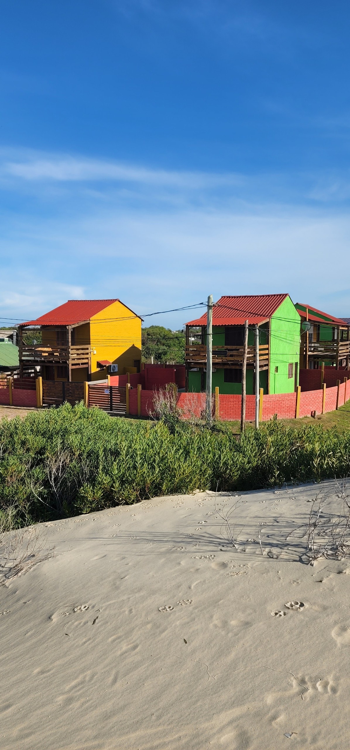 Casa pé na areia com deck privativo com escada a beira mar, sacada ampla inferior e superior, deck com bancos, espreguicadeiras e rede. Forno e fogão a lenha, além de churrasqueira tipo parrijeira e lareira. Cozinha completa. Peças amplas e arejadas. Colchões com capas higienizáveis. Um paraíso para festejar com amigos e familia. Tem pranchas, morey e bicicleta. A noite do deck superior se pode ver a iluminação do farol do Chuí, que divide Brasil e Uruguai.
