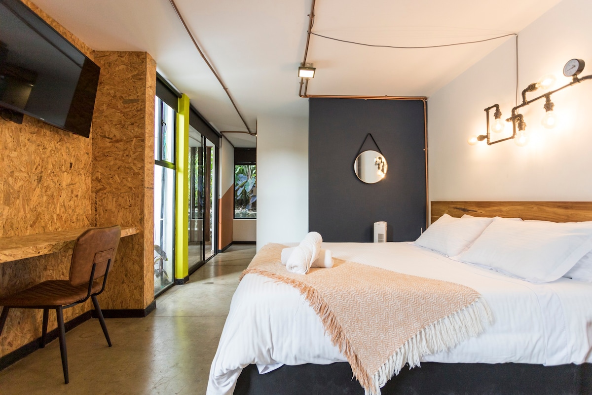 Moderna suite completamente amueblada, cocina, baño privado, 1 cama queen y un sofá cama, 500 MB de internet, aire acondicionado, escritorio, comedor y espectacular vista a la ciudad. El edificio está ubicado en el mejor barrio de Medellín, El Poblado, cerca de la Universidad EAFIT, la Milla de Oro, centros comerciales, supermercados, restaurantes y la estación Aguacatala del metro. Cuenta con zona de coworking, café, gimnasio, minimercado, spa y vigilancia las 24 horas.