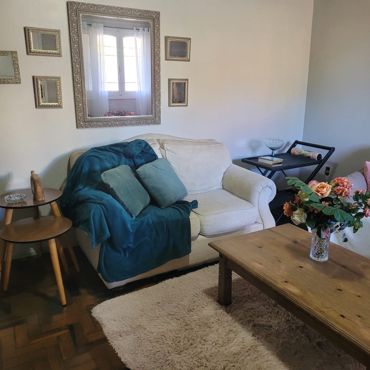contamos con un amplio dormitorio con vista al jardín del frente a través de un gran ventanal, el balcón está enrejado y es techado por lo que es seguro. La cama y sillas son Luis XV con sábanas, toallas, tv Smart, estufa a leña (la leña es por cuenta del huésped) y aire acondicionado. Contamos con un segundo dormitorio con dos camas de una plaza. además una cocina pequeña completa con utensilios básicos.