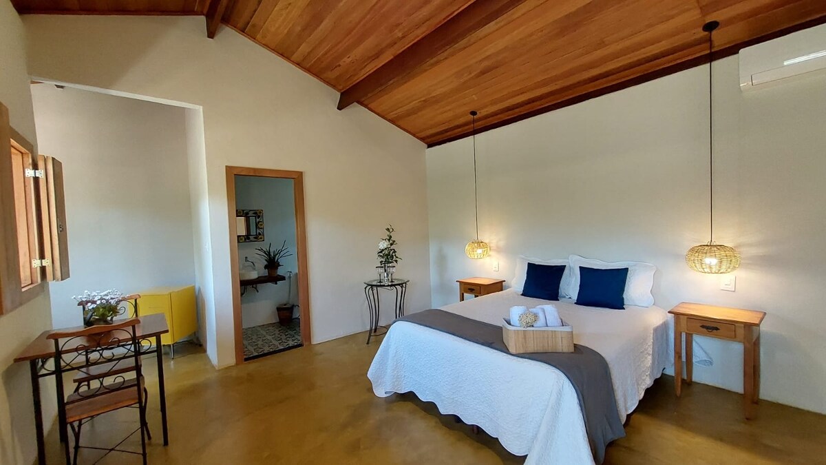 São 2 chalés na propriedade. Chalé c/ ar-c., espaçoso, local tranquilo a 400m da área comercial. Teto c/ forro de madeira no estilo catedral; sensação de amplitude e aconchego. Suite c/ cama queen casal e enxoval (projetado p/ acomodar mais 2 camas extras de solteiro). Cozinha p/ o preparo do seu lanche ou delivery. Possui misteira, cafeteira, talheres, louças, frigobar, bancada c/ pia, mesa e cadeiras (sem fogão). Anúncio sem café da manhã. Não aceitamos pet.
