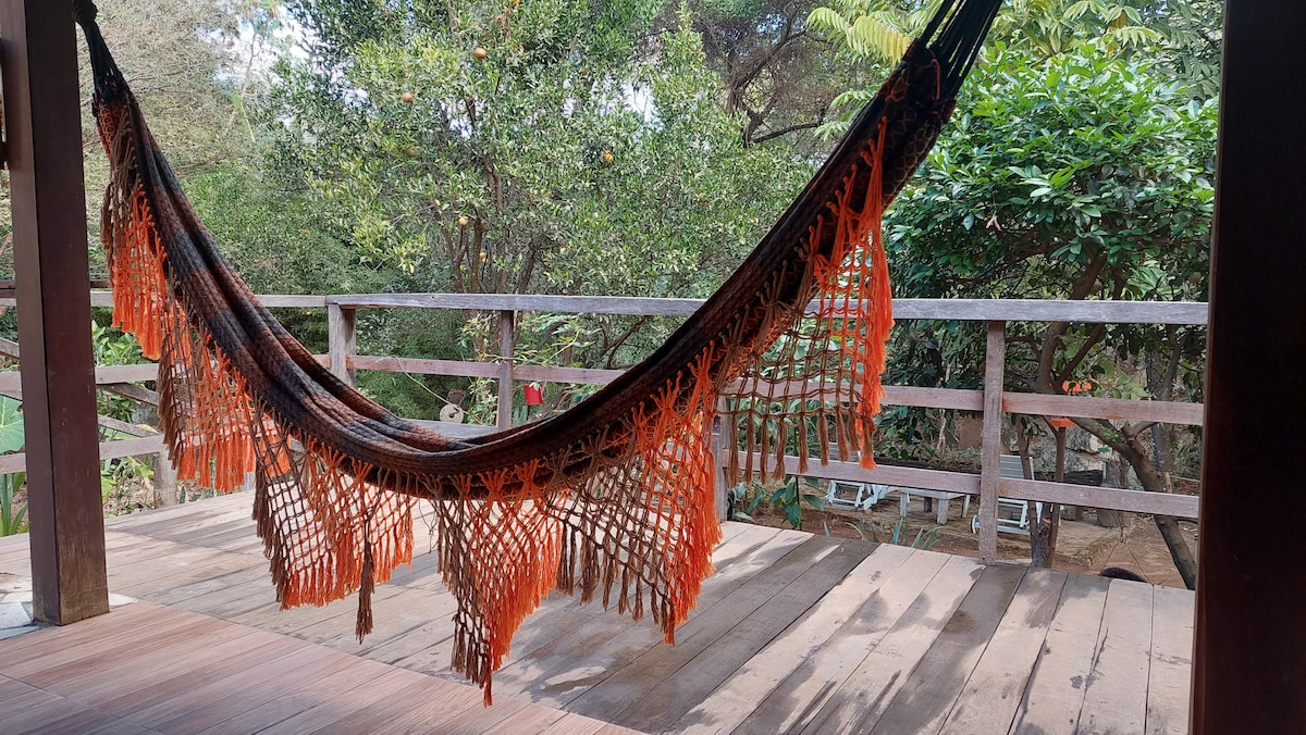 Rodeada por um quintal de vegetação nativa de cerrado, o Canto Acá é um sobrado acolhedor, com linda vista pra serra! Aconchega confortavelmente até 8 pessoas, 4 em cada piso (2 banhos). Mas é perfeito também pra casais, grupos menores, devido à sua configuração especial. Tem cozinha completa, redes, ducha externa pra refrescar. Deixamos a casa meio "transparente" pra que as montanhas e a lua possam adentrar...Mas com blackouts nos quartos! Há 1km do centrinho. Bem-vinda! Bem-vindo!