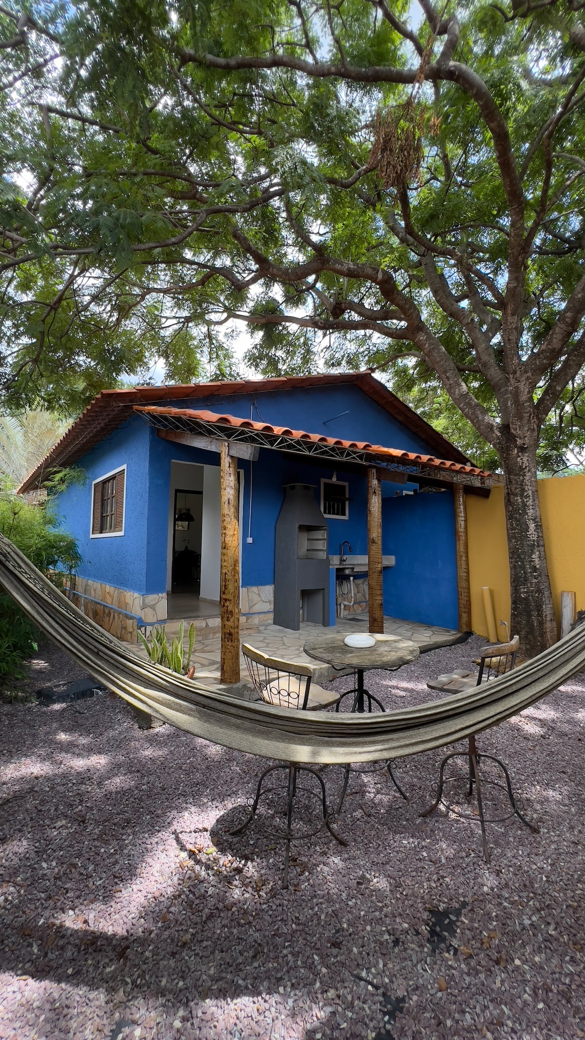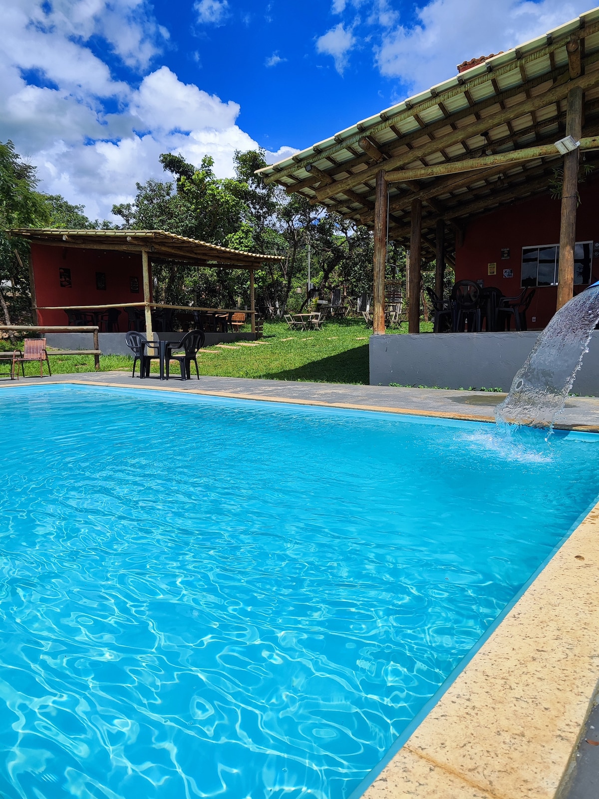 Aqui você vai aproveitar a natureza. A casa conta com um espaço gourmet totalmente integrado à piscina com deck coberto por videiras, gramado e chuveirão, tudo envolvido em um belo paisagismo para você aproveitar com sua família, amigos e pets. A casa fica a 400 metros da cachoeira Véu da Noiva, a 2 minutos de carro do centro comercial com bares e restaurantes e bem próxima aos setores de escalada. Conforto e segurança. Seja bem vindo(a)!