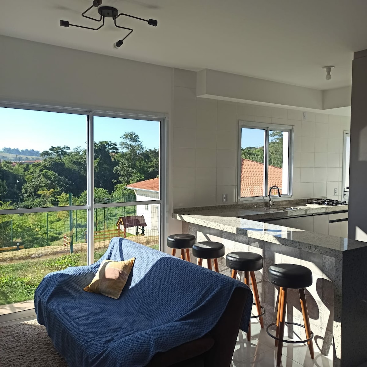 Apartamento aconchegante, confortável e bem iluminado, pensado para quem busca tranquilidade e descanso em Águas de São Pedro. Conta com quarto climatizado e cama queen, sala confortável com TV e acesso à Netflix, mini cozinha equipada e agradável varanda com jardim em frente. O condomínio oferece piscina, sauna, sala de TV/jogos, espaço fitness e lavanderia. Excelente localização, com fácil acesso a comércios, restaurantes e atrações da cidade. Estamos a 10 minutos do parque aquático Thermas.