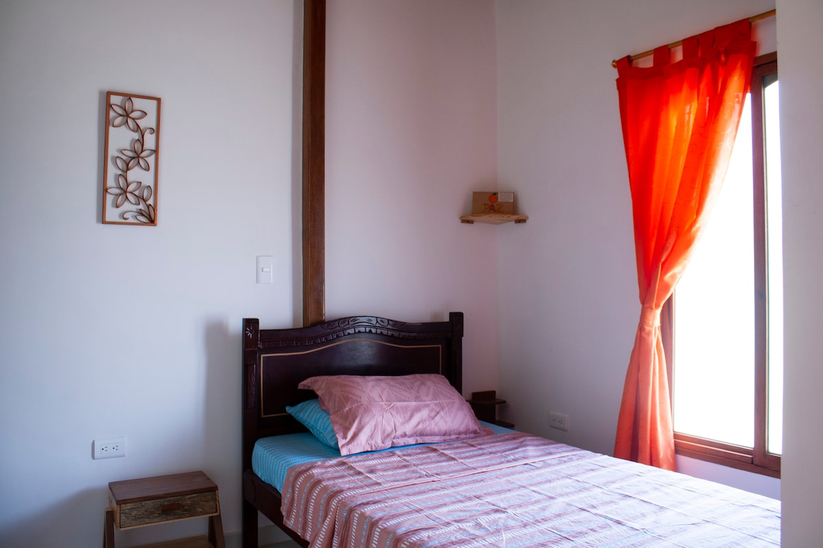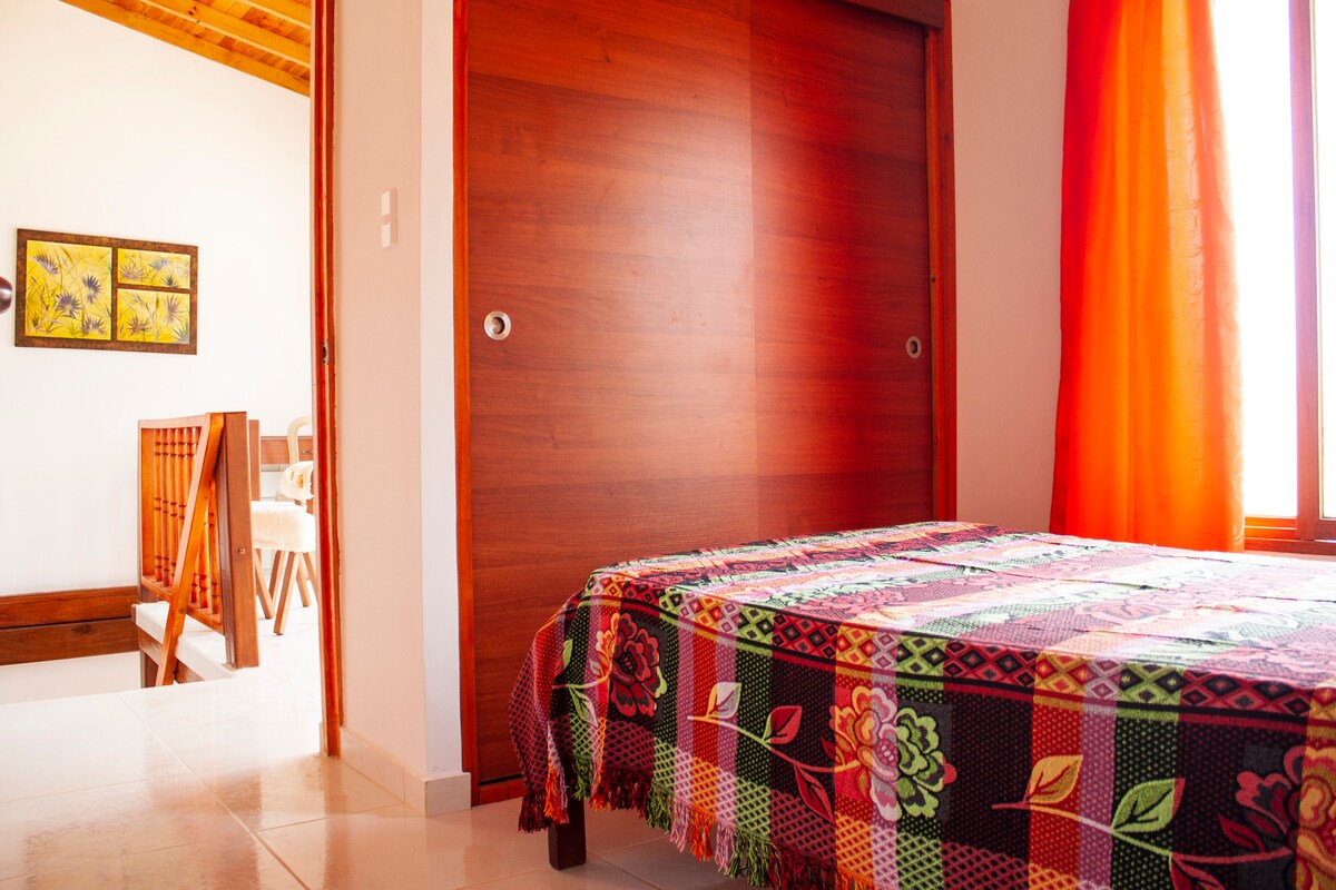 Está en el solar de Albahaca Hospedaje Tienda, en Barichara, para amantes de la naturaleza, pues está rodeada de árboles y fauna silvestre. Consta de una habitación con dos camas sencillas, cocina, comedor y baño, agua caliente. El precio es por persona. Hay descuento para estancias largas. It's for lovers of nature, since it's surrounded by nature and wildlife. It has a bedroom with two single beds, kitchen, dinning room and private bathroom. It's just 5 minutes' walk from city centre.