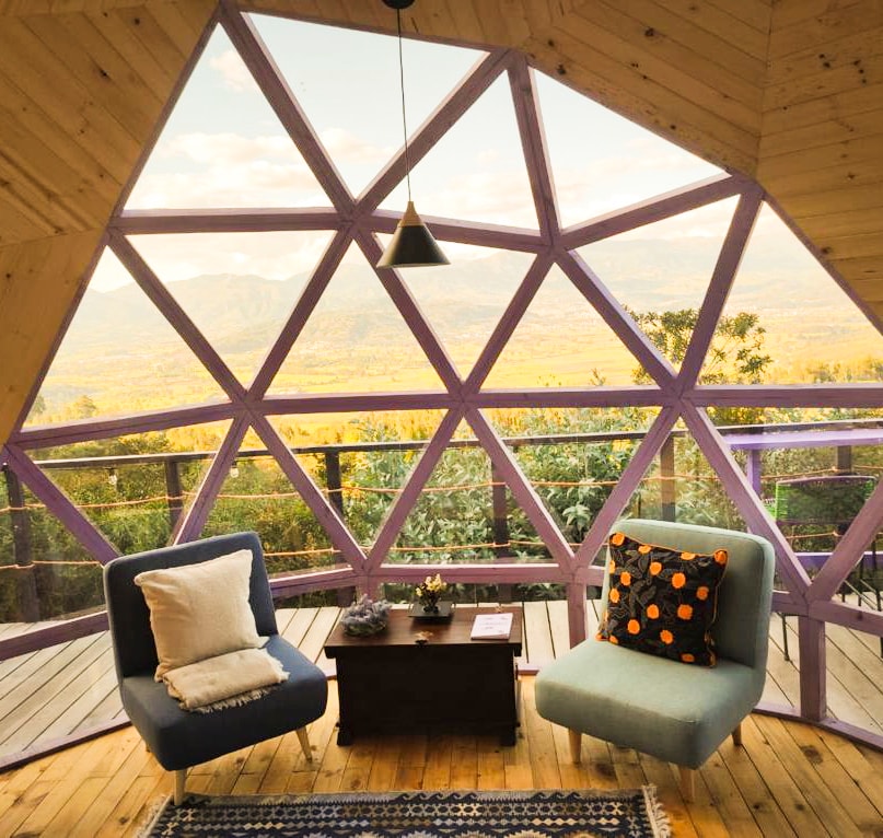 Ubicado en una espectacular plataforma aérea, con una increíble vista panorámica se encuentra el Domo/Glamping Lulú. Su cama King con plumón asegura noches de ensueño, y su estructura ofrece calidez en las noches frías de la montaña. Este Domo/Glamping es ideal para crear recuerdos inolvidables. Cuenta con mesa de comedor, ducha de agua caliente, y una cocina completamente equipada. Estar en su balcón es desconexión total… el mejor espacio para leer y conversar.